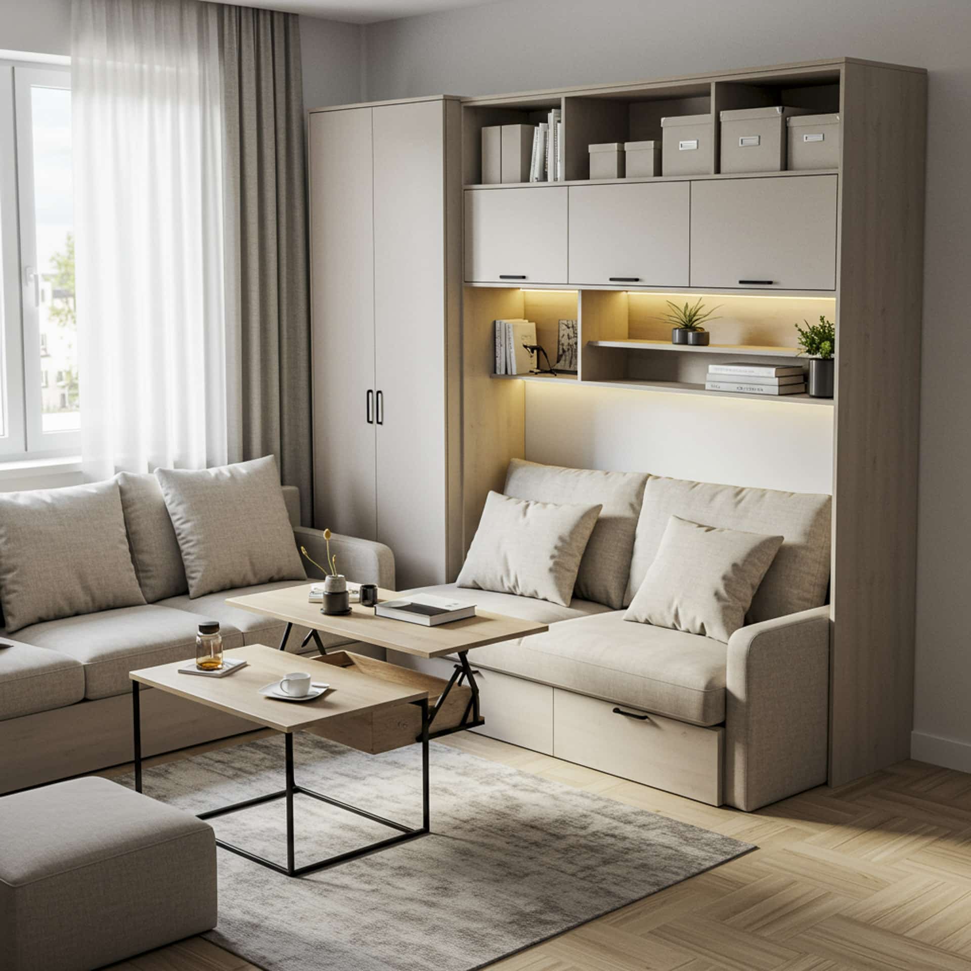 Canapé convertible, rangements modulables, table extensible