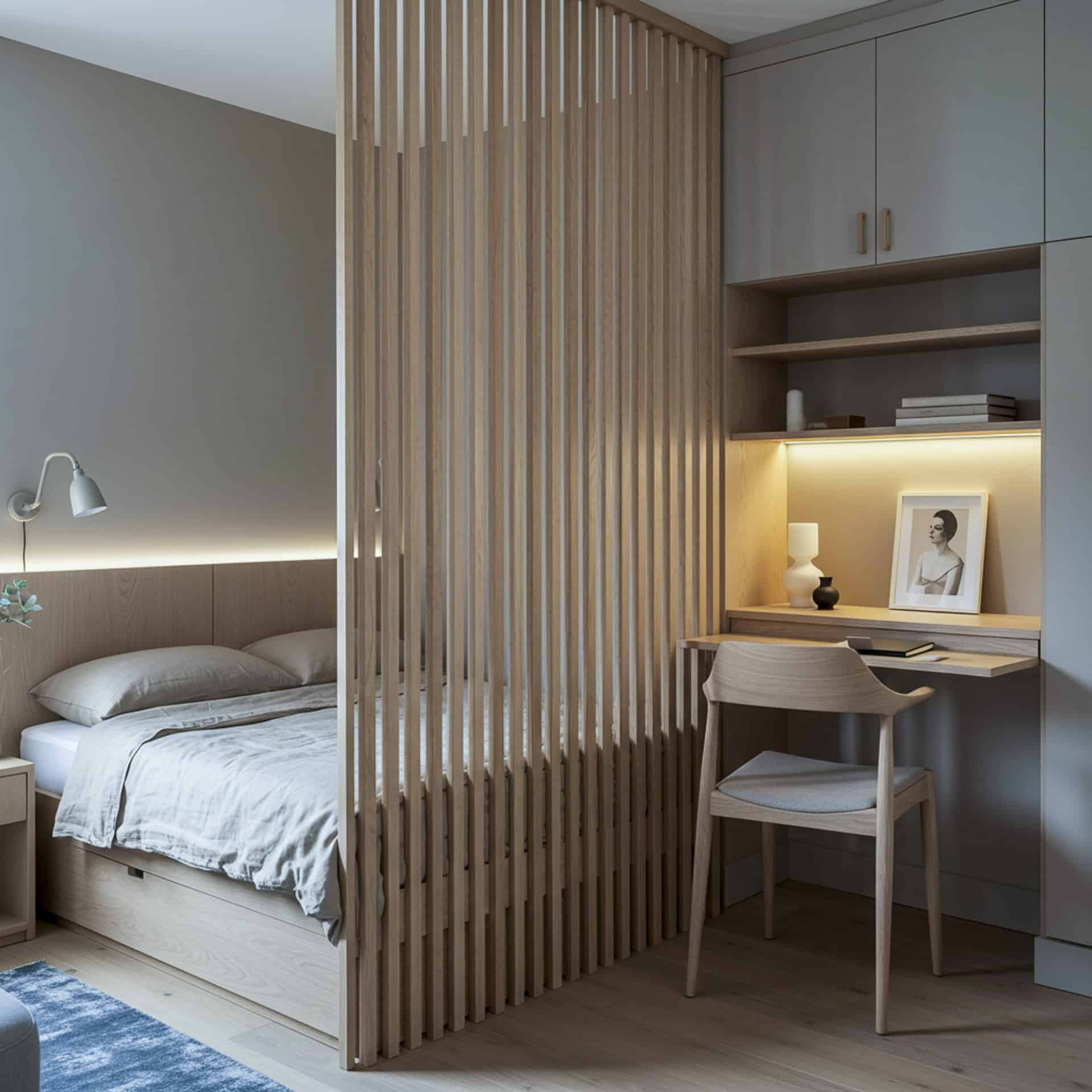 Pour les zones plus complexes comme l’entrée ou le coin nuit dans un studio, pensez aux claustras ajourés, aux panneaux japonais coulissants, voire à des portes coulissantes à galandage sont d’excellentes options pour un aménagement Bureau discret et élégant dans les petits espaces. Ces solutions permettent de gagner en intimité sans encombrer l’espace au sol, et s’adaptent à tous les styles.
