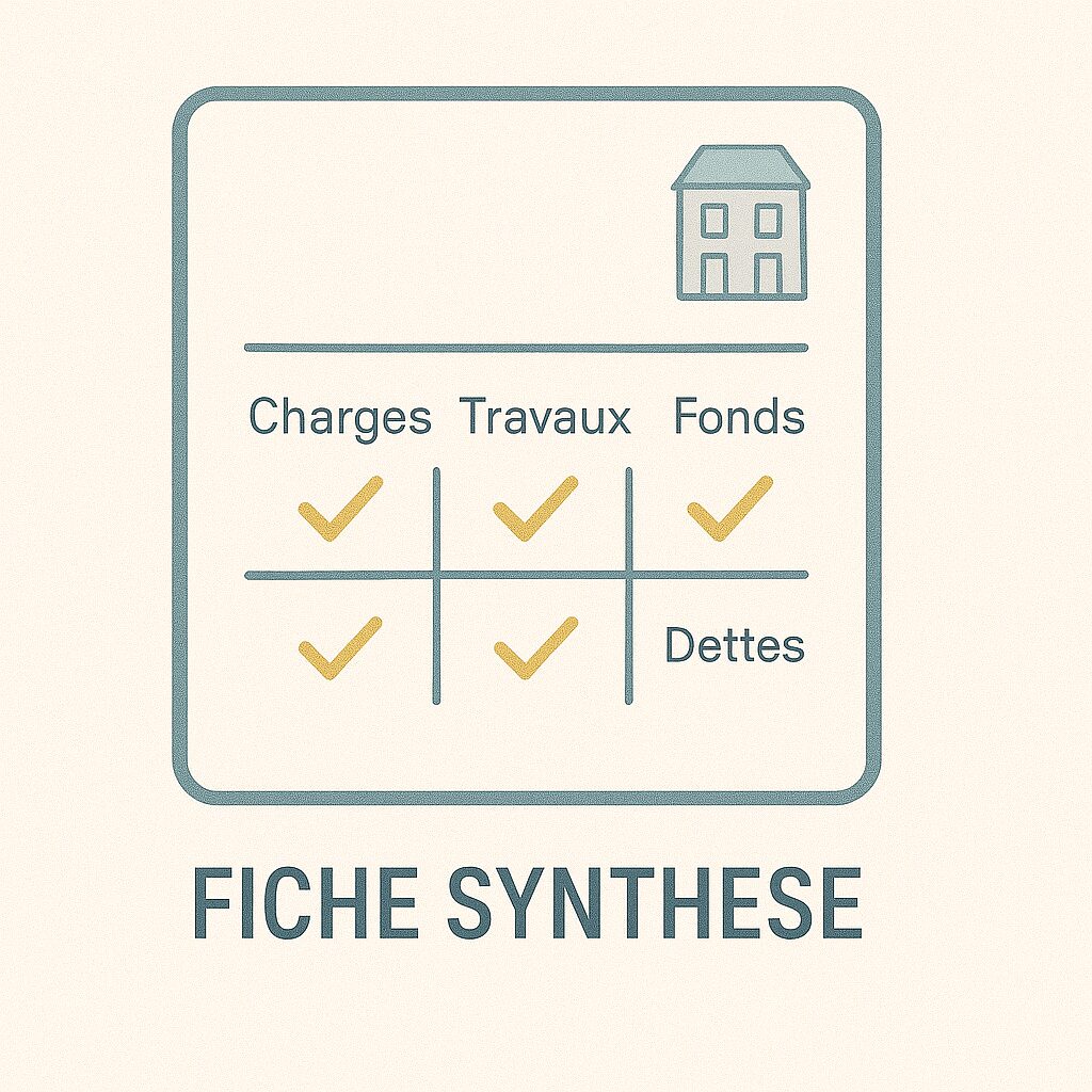 Demandez la fiche synthétique de la copropriété (obligatoire depuis 2018) pour obtenir un aperçu global : nombre de lots, montant des charges, dettes, fonds de travaux, quote-part de tantièmes.