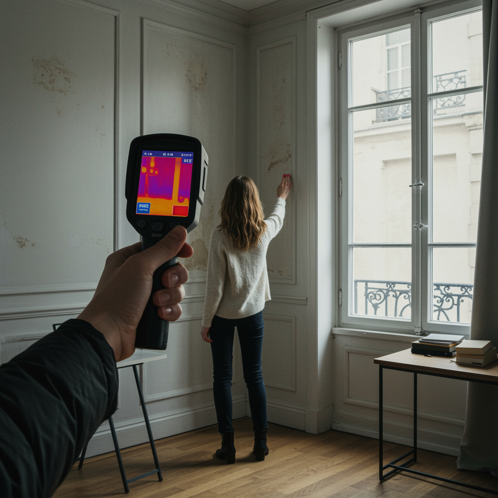 L’humidité est l’un des problèmes les plus fréquents dans l’immobilier ancien à Paris. L’expert utilise des outils de mesure pour identifier les zones affectées : taches, auréoles, condensation, moisissures, remontées capillaires ou défaut d’étanchéité.