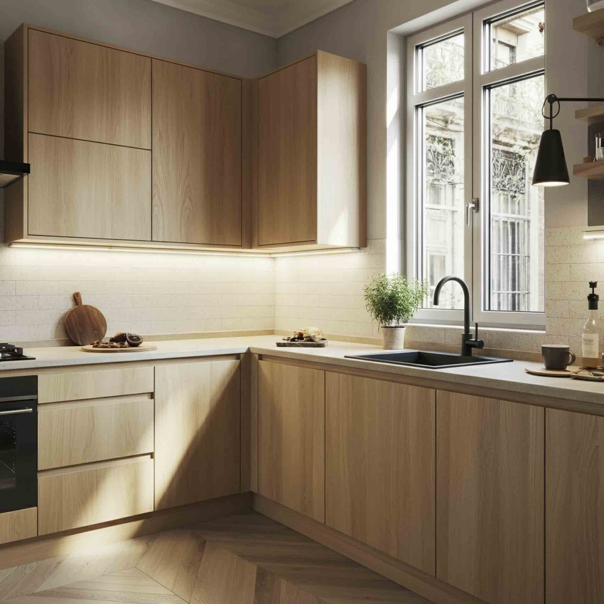 Adapter chaque matériau à la pièce : dans la cuisine ou la salle de bain, privilégiez des surfaces résistantes à l’humidité et à la chaleur comme le grès cérame, le quartz ou le stratifié compact. Pour le salon ou la chambre, optez pour la chaleur du bois, les enduits minéraux ou les tissus naturels.